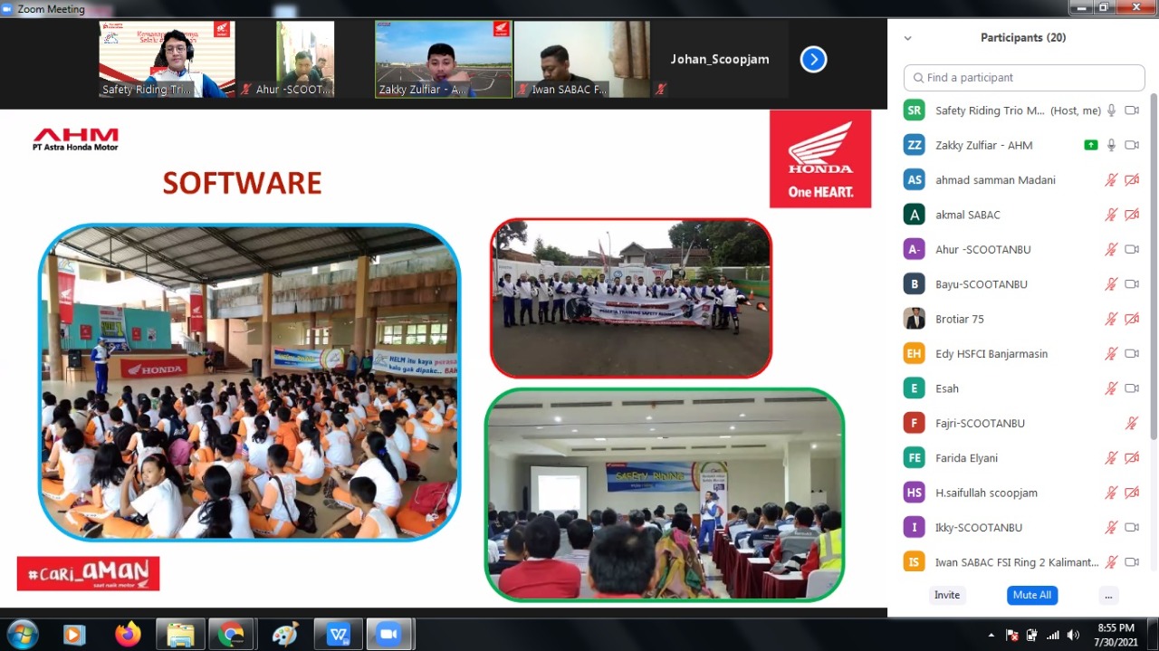 Banjarmasin – PPKM Level IV diperpanjang namun PT Trio Motor selaku Main Dealer sepeda motor Honda di wilayah Kalimantan Selatan dan Kalimantan Tengah tetap konsisten mensosialisasikan tagar Cari_Aman. Kali ini kegiatan edukasi dilaksanakan sembari sharing dengan komunitas motor Honda Kalimantan Selatan dan Kalimantan Tengah, pada akhir pekan lalu. Kegiatan yang diikuti oleh lebih dari 35 orang anggota komunitas IMHKST (Ikatan Motor Honda Kalimatan Selatan dan Kalimantan Tengah) ini dilaksanakan virtual.