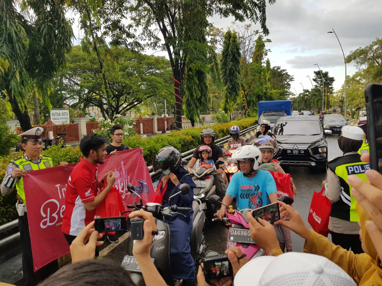 Banjarmasin – PT Trio Motor selaku Main Dealer Honda di Wilayah Kalimantan Selatan dan Kalimantan Tengah bersama Satlantas Polresta Kota Banjarmasin turun ke jalan dan membagikan takjil kepada para pengendara roda dua yang melintas dilampu merah siring Sabilal Muhtadin (25/5). Kegiatan bagi-bagi takjil ini serentak dilaksanakan oleh PT Trio Motor beserta 59 jaringan Dealer yang tersebar di Kalimantan Selatan dan Kalimantan Tengah kepada pengendara dan warga sekitar Dealer Honda.