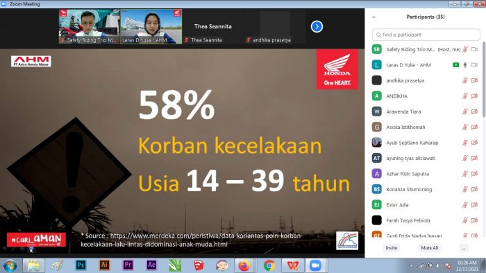Pada akhir tahun 2021 ini, kegiatan di luar rumah sudah perlahan-lahan kembali normal. Karena itu maha tentunya akan meningkat pula mobilitas masyarakat, tak terkecuali para mahasiswa. Seiring bertambahnya usia, maka kegiatan yang dilakukan serta rutinitas semakin banyak. Dengan kegiatan yang padat serta kewajiban untuk terus aktif menuntut ilmu dan mengembangkan diri, maka mobilitas yang tinggi adalah hal yang sudah menjadi makanan sehari-hari. Pemahaman mengenai cara dan kebiasaan berkendara sepeda motor yang benar secara konsisten terus disosialisasikan oleh instruktur safety riding PT Trio Motor. Trio Motor selaku Main dealer Honda di Kalimantan Selatan dan Kalimantan Tengah terus memberikan edukasi keselamatan berkendara secara daring kepada seluruh peserta.