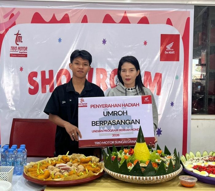 SUNGAI DANAU – Membeli sepeda motor tak hanya memberikan kemudahan mobilitas, tetapi juga membawa berkah istimewa. Hal inilah yang dirasakan pelanggan Trio Motor Sungai Danau melalui program Undian Berkah Dari Honda. Program ini menjadi bentuk apresiasi Trio Motor kepada konsumen setia dengan menghadirkan hadiah bernilai spiritual, yakni kesempatan beribadah ke Tanah Suci.