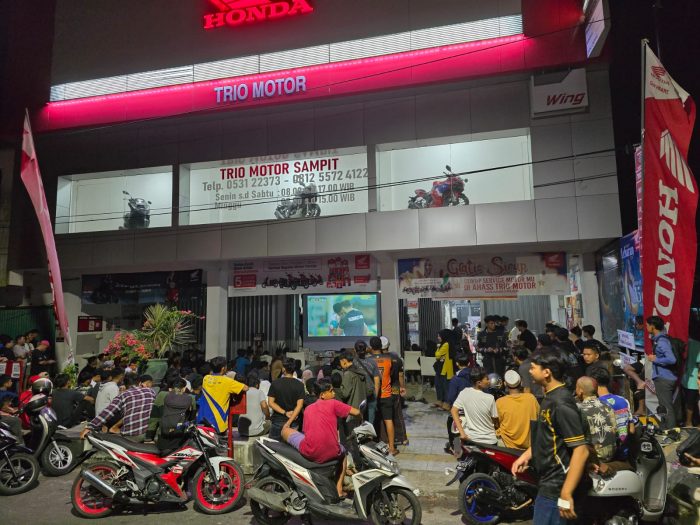 Tak ingin ketinggalan kemeriahan ini, Trio Motor Sampit menyediakan layar tancap yang digunakan sebagai media untuk nonton bareng Bersama Masyarakat Kota Sampit untuk mendukung Timnas Indonesia U23 yang berjuang demi nama bangsa Indonesia. Kegiatan ini digelar di halaman Dealer Trio Motor Sampit.