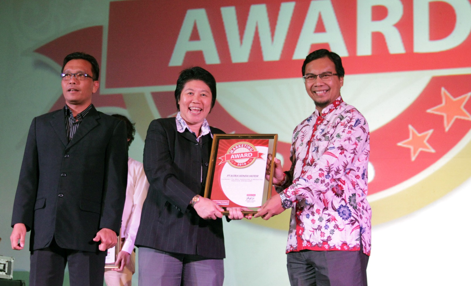 Jakarta – PT Astra Honda Motor (AHM) dinobatkan sebagai perusahaan yang sukses berinovasi dalam menjalankan strategi pemasaran dengan predikat terbaik seiring keberhasilannya meraih Marketing Award 2016 di Hotel Mulia (22/9). Penghargaan tersebut semakin memperkuat predikat Honda sebagai pemimpin pasar roda dua di Tanah air.