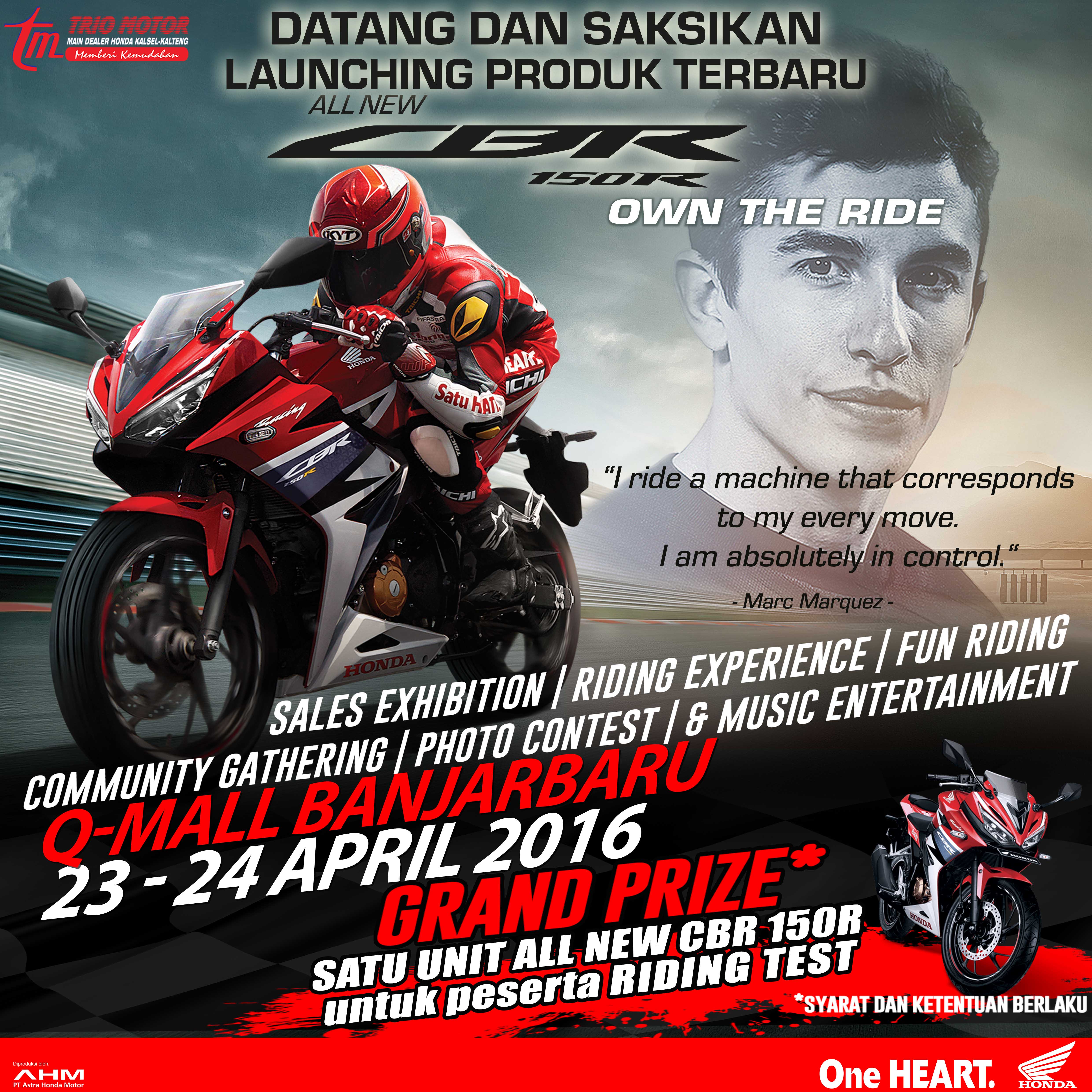 Banjarbaru- PT Astra Honda Motor (AHM) dan PT Trio Motor selaku main dealer sepeda motor Honda untuk wilayah Kalimantan Selatan dan Tengaj akan mengadakan Launching All New Honda CBR150R pada tanggal 23-24 April 2016.Bertempat di Q Mall Banjarbaru, event ini akan diisi dengan berbagai macam kegiatan seperti Sales Exhibition, Riding Experience, Fun Riding, Community Gathering, Photo Contest dan Entertainment.