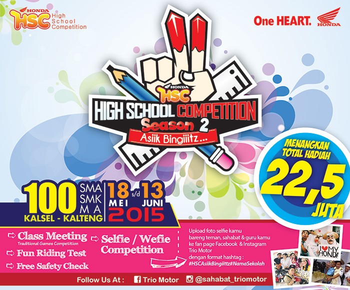Banjarmasin- Buat kalian anak SMA yang keren yang pengen ikutan Honda HSC Asikk Bingiittzz Season 2, jangan lupa up load foto tergokil kalian di facebook Trio Motor atau melalui instagram dengan men-tag foto kalian ke @sahabat_triomotor dengan hashtag #hscasiikkbingiittzz #namasekolah. Dapatkan hadiah dengan total Rp 22.500.000 untuk 3 pemenang. Buruaaannnnn!!!!!! Salam Satu HATI..